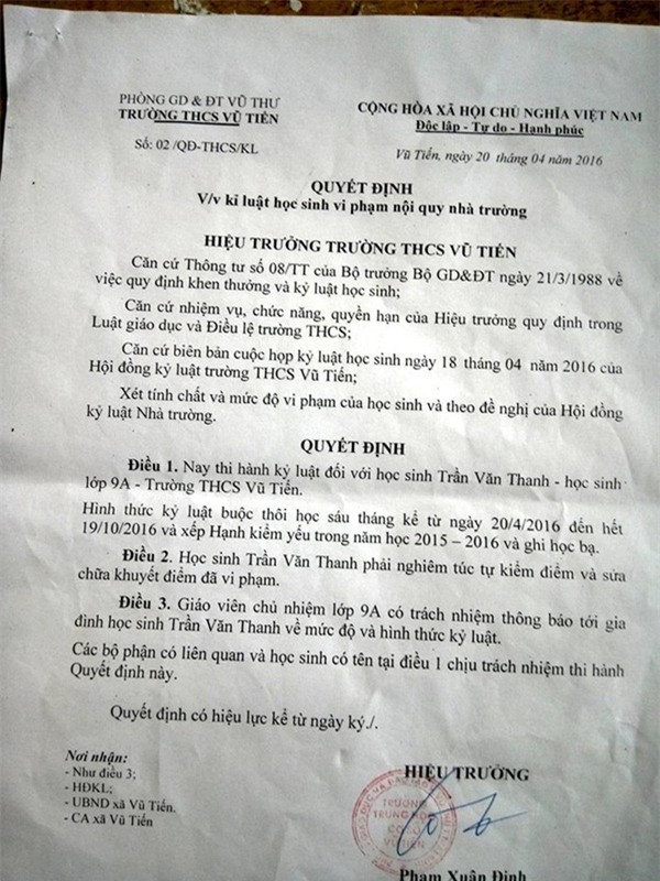 Tưởng mọi việc dừng lại ở đây nhưng ngày 20/4/2016, thầy Phạm Xuân Định mời phụ huynh 3 em đến và thông báo "đình chỉ học mỗi em 6 tháng".