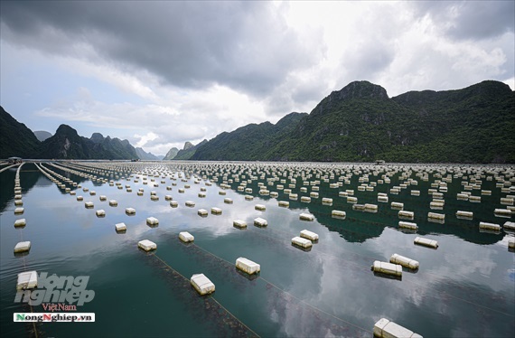 Phương pháp nuôi mới đang được áp dụng nhiều hiện nay là nuôi bằng dây phao. Mỗi dây như trong ảnh dài khoảng 200-250m và cũng treo giá thể cách nhau 20-30cm như bè tre, dùng phao xốp để giữ nổi và 2 đầu dây được treo vào cọc để định vị. Do được nuôi trong các vùng vịnh lặng gió, lặng sóng nên các mô hình nuôi này ít bị thời tiết đe dọa. Ảnh: Tùng Đinh.
