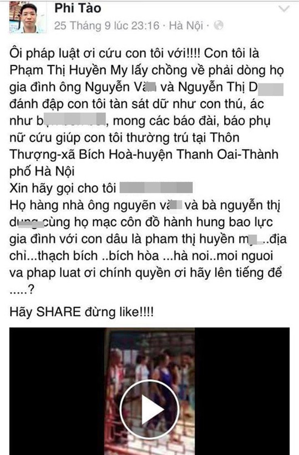 sát dữ như con thú….. Mong các báo đài, báo phụ nữ cứu giúp con tôi”, chủ tài khoản facebook chia sẻ.