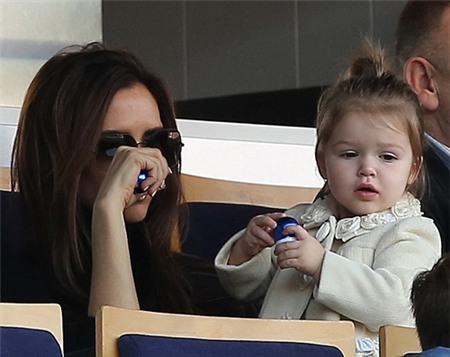 | Khi đại gia đình nhà Becks rất gây chú ý khi bước vào khán đài. Cô nhóc Harper được mẹ diện áo khoác trắng nổi bật khiến mọi người không khỏi xuýt xoa với vẻ dễ thương của bé. Phần lớn thời gian, cô bé 19 tháng tuổi chỉ giương đôi mắt tò mò, ngơ ngác nhìn xung quanh nhưng cũng có khi bé hò hét thích thú khi nhìn thấy bố trên sân. |