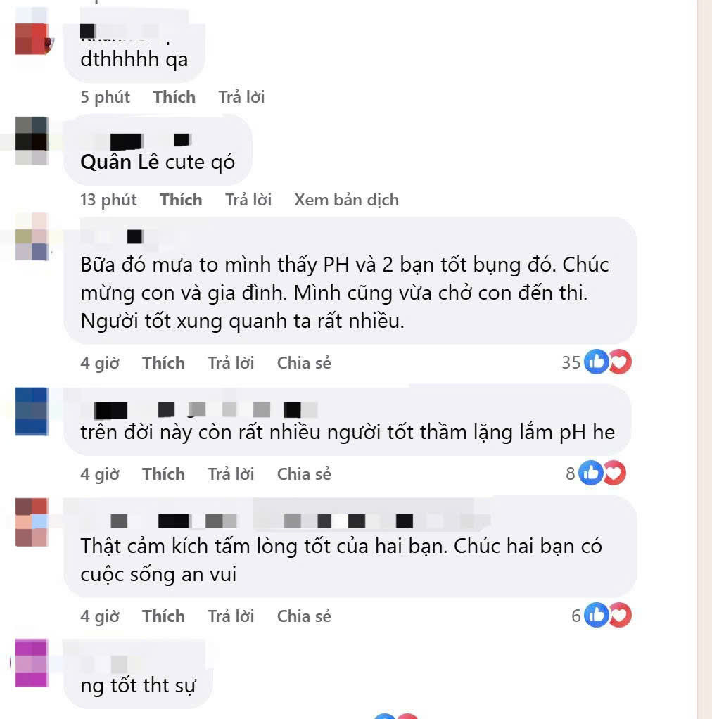Mặc dù mọi người đều bị ướt sũng vì mưa to nhưng may mắn thí sinh đã đến vừa kịp lúc làm bài. Tối ngày 23-6, khi hay tin con gái đậu đã vào Trường THPT chuyên Trần Đại Nghĩa, lòng ông L. thầm cảm ơn 2 chàng trai ân nhân. Bởi lẽ, nếu không nhận được sự giúp đỡ ngay lúc đó, rất có khả năng con ông không thể trúng tuyển vào ngôi trường mơ ước.