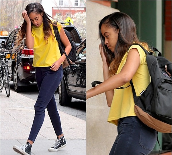 Cô Malia Obama trở lại nơi làm việc trong trang phục áo thun vàng cùng quần jeans đơn giản vào sáng ngày 14/04.