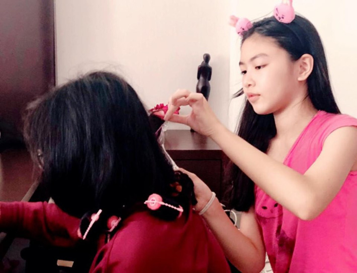 Dù năm nay mới 14 tuổi nhưng cô bé Lọ Lem (tên thật là Thảo Linh) – con gái lớn MC Quyền Linh và bà xã Dạ Thảo đã sớm có tố chất thành beauty blogger đình đám. Minh chứng chính là khả năng làm tóc điệu nghệ và nhan sắc xinh xẻo hứa hẹn sẽ rất hút ống kính của cô bé. Mới đây, Lọ Lem lại bộc lộ tài năng khi trổ tài làm tóc cho cô bé Bí Ngô (con gái nghệ sĩ Hồng Vân).