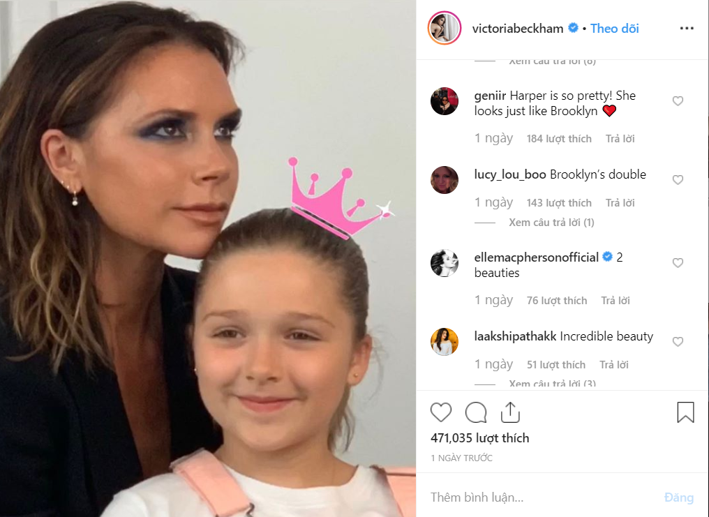 Giờ thì các fan sẽ khỏi phải thắc mắc cô con gái độc nhất của Beckham giống ai nhất nhà rồi nhé.