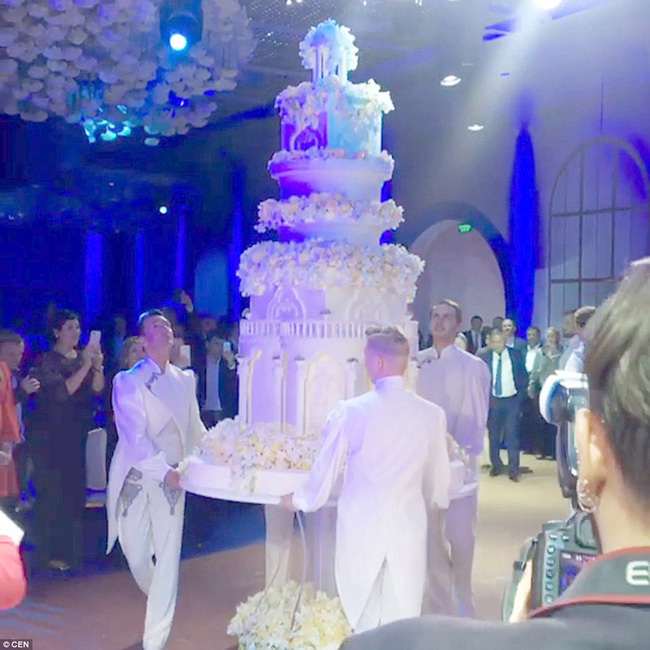 Chiếc bánh cưới của hôn lễ cao 3m và cần có đến 4 người đàn ông khỏe mạnh mới bê vào được. Được biết, đây là tác phẩm của đầu bếp lừng danh Renat Agzamov. Ông là nhà vô địch bánh ngọt nổi tiếng tại Nga.