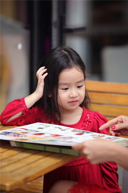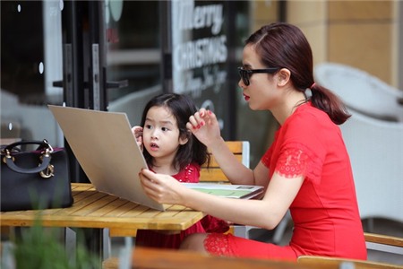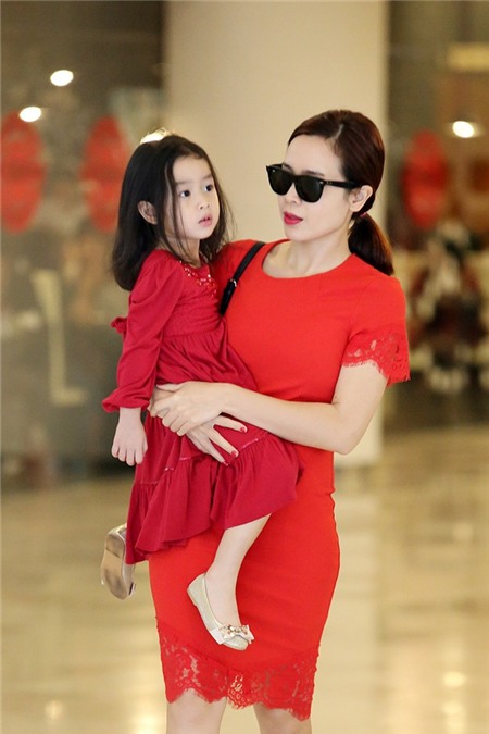 Lưu Hương Giang gây chú ý khi diện chiếc váy đỏ gợi cảm được mix cùng kính, túi xách và giày đen. Trong khi đó con gái lại xuất hiện trong bộ váy maxi như công chúa.