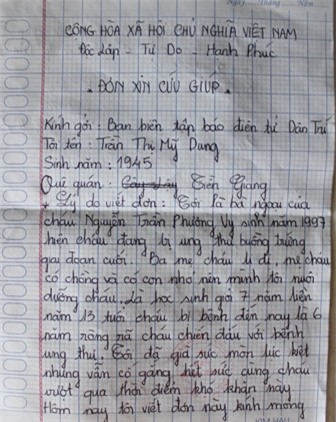 Đơn xin cứu giúp của bà Dung gửi đến Ban biên tập báo Điện tử Dân trí