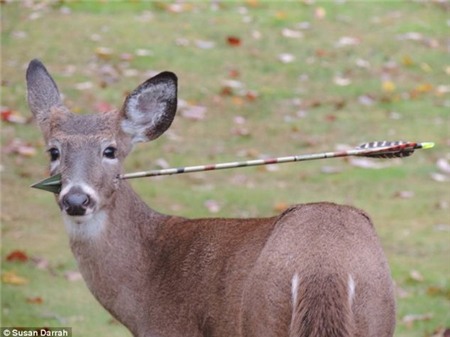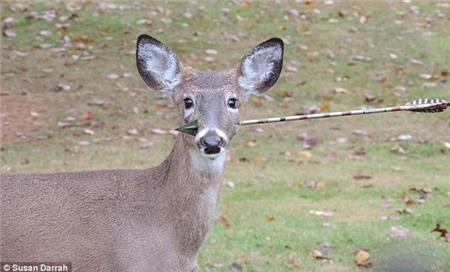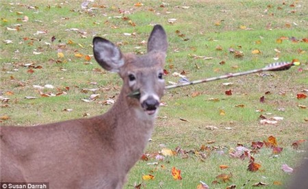 Những hình ảnh gây sốc này mới được cô Darrah đăng tải trên trang mạng xã hội. Cô cho biết đây là con nai thường xuyên vào vườn nhà mình và có thể nó đã bị một thợ săn bắn vào mặt.