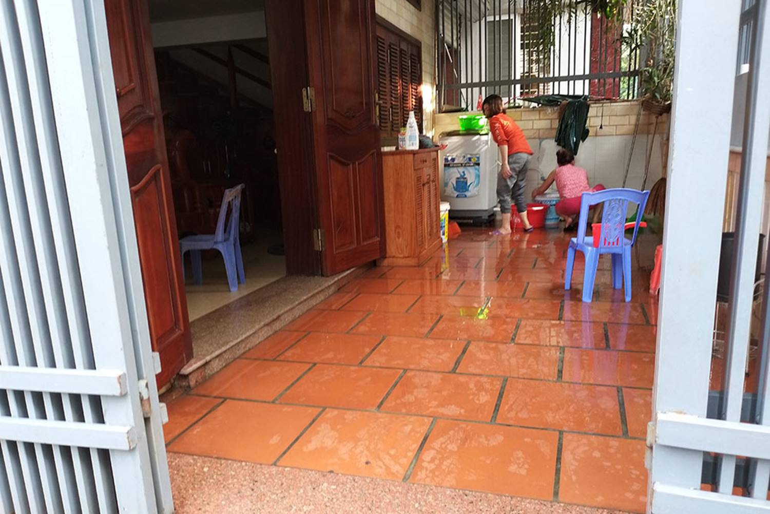 | Bà H. cùng hàng xóm lau dọn nhà sau mỗi lần bị ném chất bẩn |
