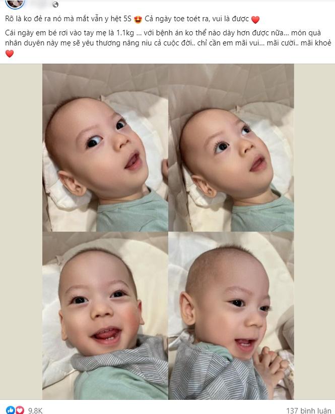 "Rõ là không đẻ ra nó mà mắt vẫn y hệt 5S, cả ngày toe toét ra, vui là được. Cái ngày em bé rơi vào tay mẹ là 1,1 kg với bệnh án không thể nào dày hơn được nữa.