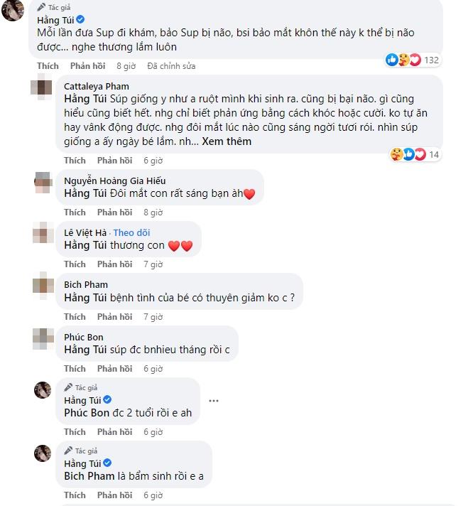 Ngoài ra, Hằng "Túi" cũng cho biết Súp hiện được 2 tuổi. Khi có người hỏi về bệnh tình của cậu bé có thuyên giảm không, hot mom chỉ nói bệnh của em là do bẩm sinh từ bé.
