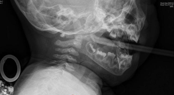 Khi đến được bệnh viện tuyến trên thì bé trai đã có hiện tượng môi tím tái và có nguy cơ ngạt thở. Qua ảnh chụp X-quang cho thấy chiếc que nhỏ đã cắm thẳng vào vòm họng của đứa trẻ, dù phần trước của que rất cùn, không phải là vật sắc nhọn. Sau khi hội chẩn, các bác sĩ quyết định sử dụng phương pháp nội soi gắp dị vật và gây mê toàn thân.