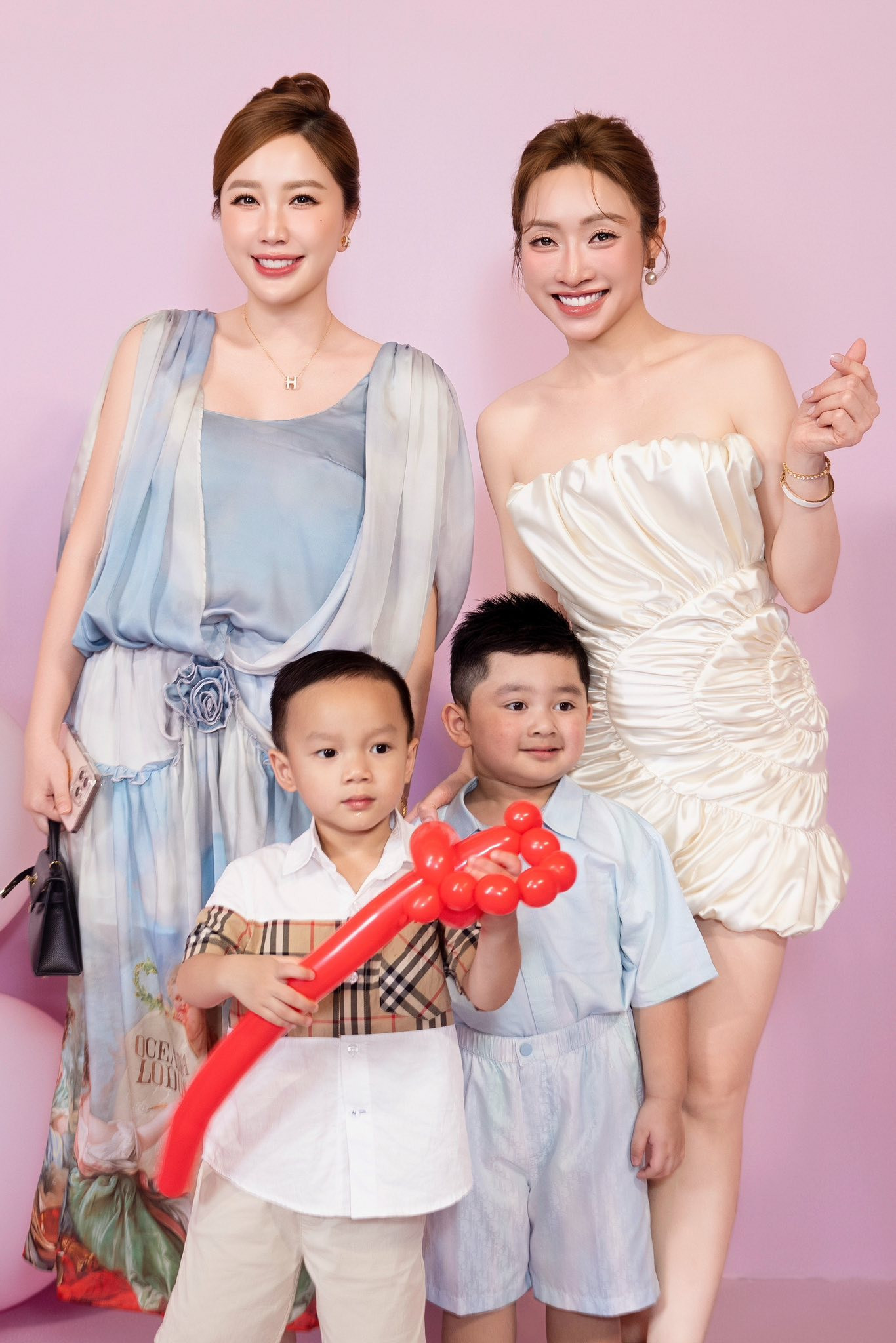 Trên trang cá nhân, Bảo Thy cũng xả ảnh kèm dòng trạng thái: "Đi sinh nhật em bé Gia Linh tròn 1 tuổi mà không có tấm nào chụp với em bé cả toàn 2 mẹ với 2 anh tranh nhau lên sóng. Ngại quá Lý Thùy Chang ơi."