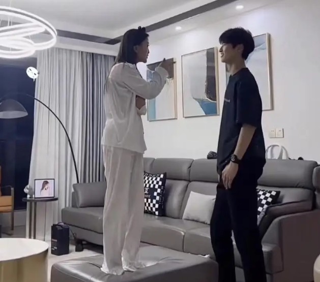 Ban đầu, bà mẹ trong bộ đồ màu trắng, đứng ở phòng khách khoanh tay và vẻ mặt rất nghiêm túc, tức giận để mắng cậu con trai. Tuy nhiên tình huống có vẻ khá chênh lệch khi cậu con trai cao tận 1m93 trong khi đó bà mẹ thì "nấm lùn" chỉ cao 1m6, còn chưa cao tới vai của con.