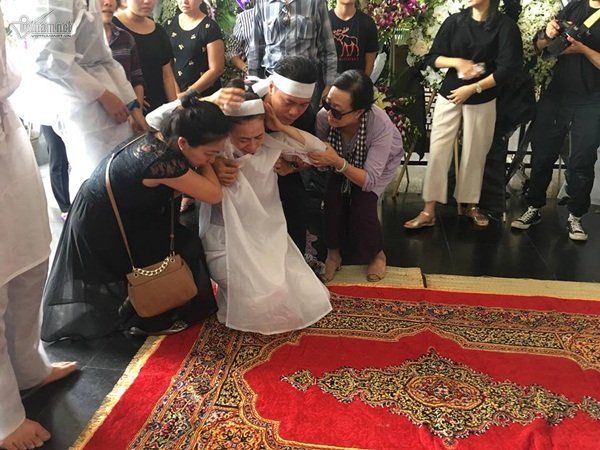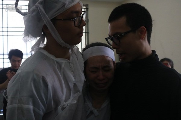 | Ba mẹ con ôm nhau khóc trước linh cữu cố nghệ sĩ Thanh Hoàng. |