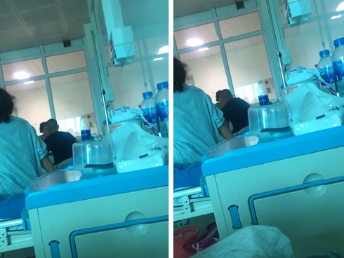 Mặc dù người mẹ đang phải nhập viện, nhưng thay vì chăm sóc, người con trai này có lúc không kiềm chế được