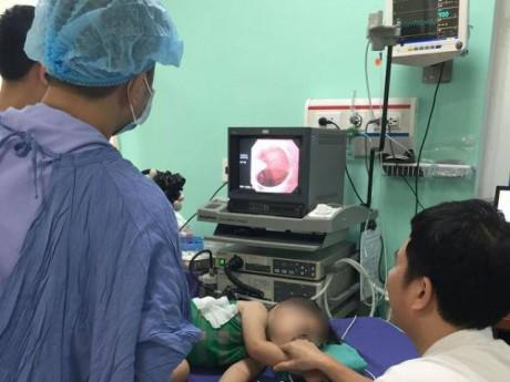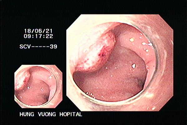 Sau 20 ngày thấy con đi ngoài ra máu liên tục, gia đình đưa cháu M. đi khám, kết quả nội soi đại tràng cho thấy cháu bị polyp trong niêm mạc trực tràng.