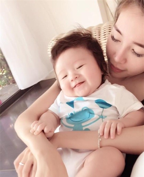Người đẹp sinh năm 1987 viết dí dỏm thay lời con: "Cảm giác vui vẻ nhất của mình chính là ở trong lòng chị mami cô chú nì!"