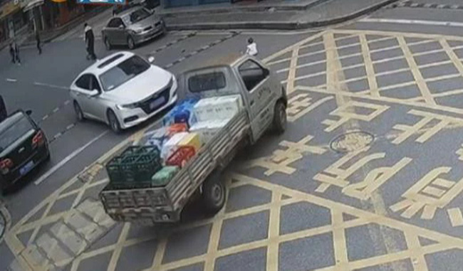 8 giây sau đó, một chiếc xe tải chở hàng đi thẳng đến ngã tư rồi rẽ trái. Tầm nhìn của tài xế lúc này đã bị chắn lại bởi chiếc ô tô nhỏ màu trắng nên đã không nhìn thấy đứa bé đang ngồi ngay dưới đất.