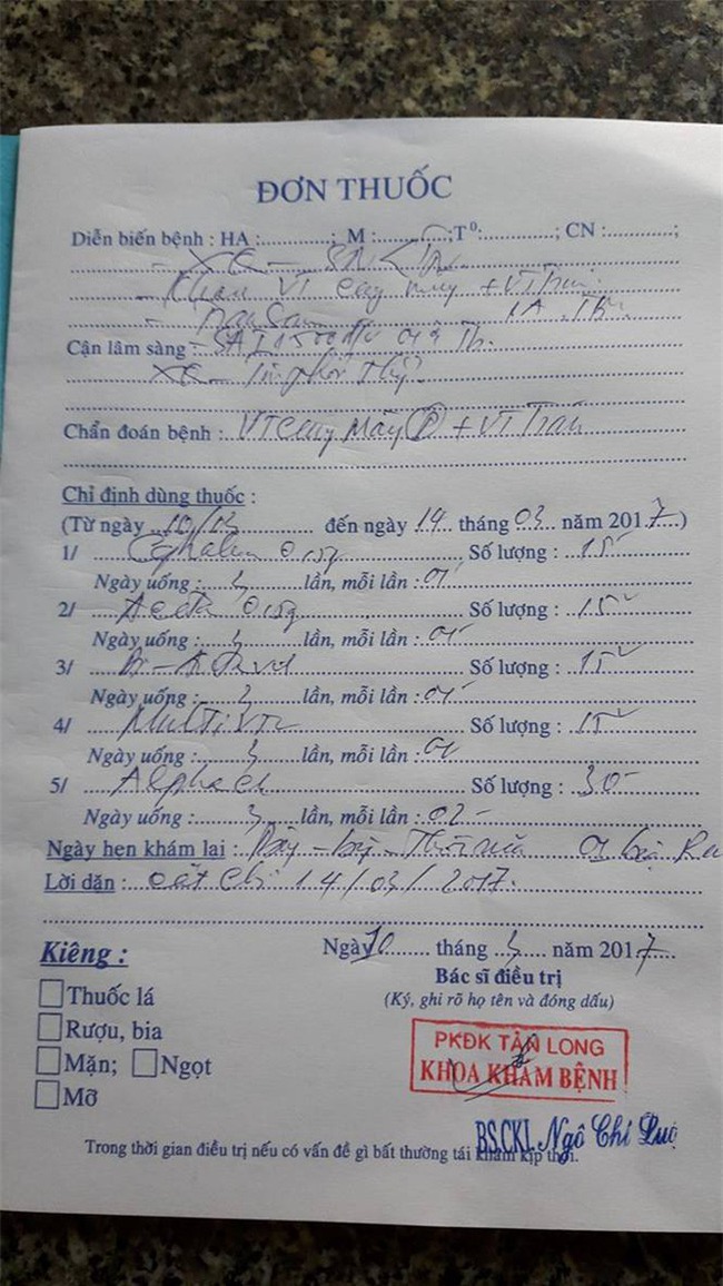 Sổ khám bệnh và đơn thuốc của bà H. trong ngày chị bị bạo hành, phải đi khâu 4 mũi tại một phòng khám ở địa phương. (Ảnh: NVCC)