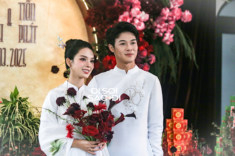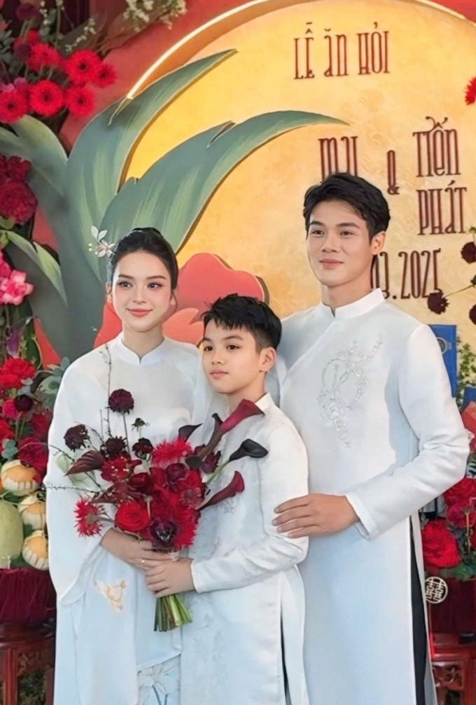 Không chỉ bên mẹ, bé Gấu còn xuất hiện trong nhiều khoảnh khắc cùng Tiến Phát. Trong giây phút cặp đôi chính thức bước vào hôn trường, cậu bé đi ngay phía sau, ánh mắt không hề có sự xa lạ hay dè dặt mà ngược lại, toát lên sự thoải mái, vui vẻ.