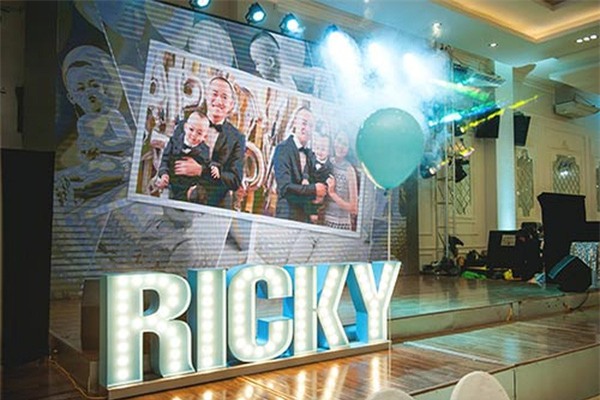 Phông nền của buổi tiệc là màu xanh ngọt ngào. Hình ảnh của bé Ricky từ lúc lọt lòng đến 1 tuổi được trưng bày khéo léo. Thậm chí mọi người đến dự sự kiện còn được đọc những thông tin thú vị về nhân vật quan trọng của bữa tiệc. Ở tuổi thứ 1, Ricky có 5 chiếc răng, em cao 80cm, nặng 10,5kg, biết phân biệt mọi thứ. Bé rất hay cười, dù gặp người lạ em cũng cười vì thế cậu bé được gọi là Mr Cười xã giao.