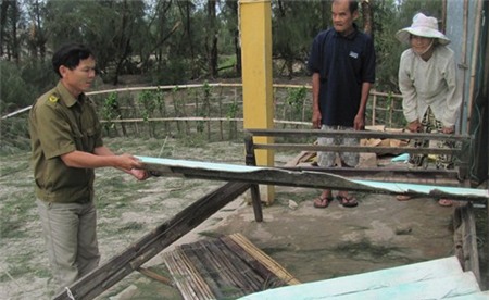 Lực lượng công an xã tại Quảng Bình giúp dân khắc phục hậu qủa bão số 10. |