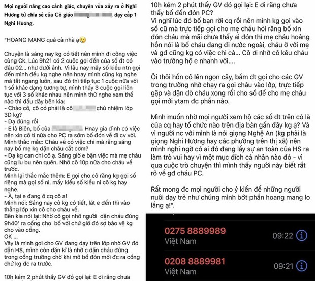 Trước đó trên mạng xã hội lan truyền đoạn thông tin chia sẻ của một cô giáo chủ nhiệm lớp 3 trường Tiểu học Nghi Hương (TX. Cửa Lò). Theo chia sẻ của cô giáo này vào sáng 11/10, cô không có tiết dạy nên không đến trường. Khi đang đi công việc thì cô giáo này nhận được nhiều cuộc gọi từ nhiều số khác nhau với dãy số 0275.888.9989 và 0208.888.9981.