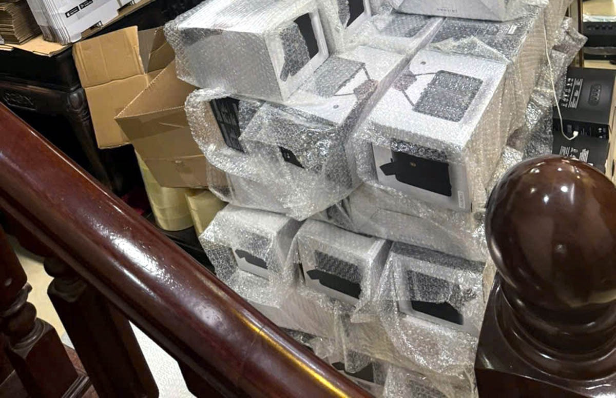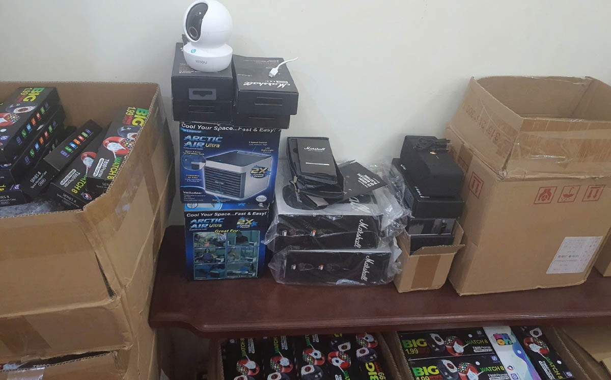 Toàn bộ quy trình tiếp cận khách hàng, bán hàng, vận chuyển và thu tiền được tổ chức tinh vi trên không gian mạng. Khám xét 2 căn nhà tại Thanh Trì, Hà Nội, lực lượng chức năng phát hiện kho hàng giả khổng lồ gồm loa, tai nghe, đồng hồ, máy hút bụi cùng nhiều hàng hóa không rõ nguồn gốc.