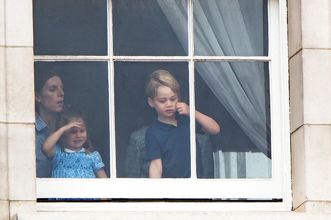 Ngày 10/7 năm nay đánh dấu kỷ niệm 100 năm của Không quân Hoàng gia. Trong khi Nữ hoàng Anh, vợ chồng William và Kate, vợ chồng Harry và Meghan cùng các thành viên hoàng gia khác đứng trên ban công Điện Buckingham chứng kiến buổi lễ kỷ niệm, Hoàng tử George và Công chúa Charlotte ở một căn phòng trong cung điện và xem qua cửa sổ.