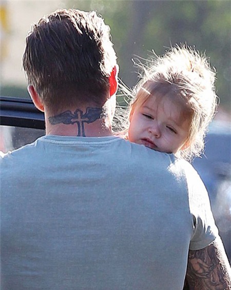 | Harper có vẻ buồn ngủ, gục đầu nằm im trên vai bố. Trong cuộc phỏng vấn mới đây, Vic thừa nhận rằng cô phải nhờ tới sự trợ giúp của bảo mẫu mới xoay xở được với 4 thiên thần nhỏ chứ không phải là một bà mẹ 'siêu nhân' một tay vừa lo sự nghiệp vừa chăm con. |