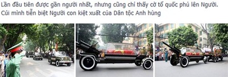 | "Lần đầu tiên được gần Người nhất, nhưng cũng chỉ thấy cờ tổ quốc phủ lên Người. Cúi mình tiễn biệt Người con kiệt xuất của dân tộc anh hùng". |