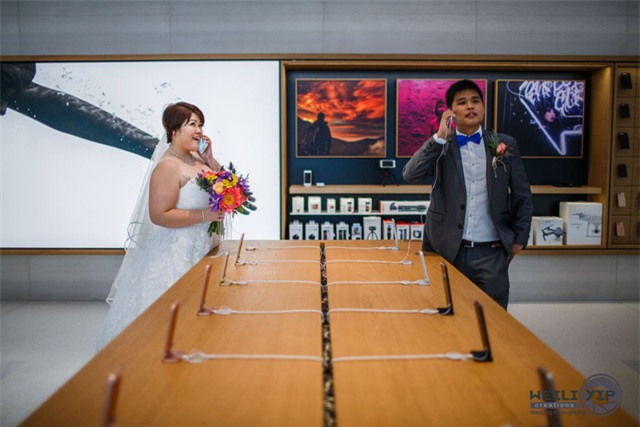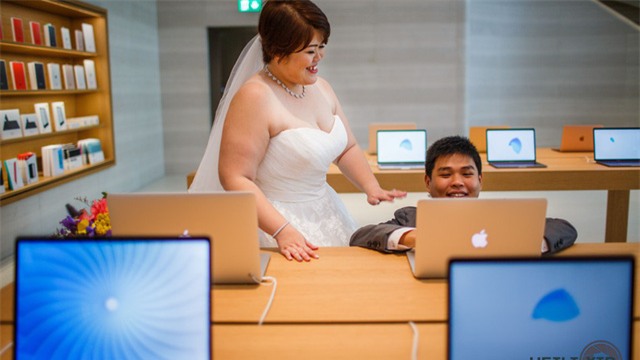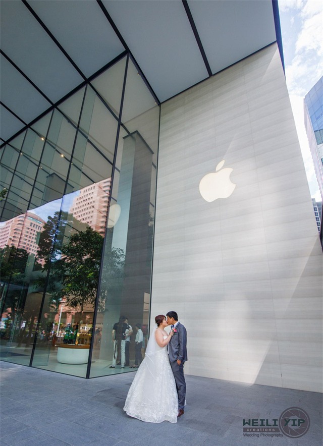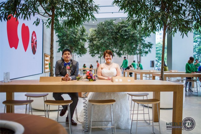 Điều duy nhất để thúc đẩy tình yêu của cặp vợ chồng Singapore này đến với nhau là niềm say mê không ngớt của họ đối với các sản phẩm của Apple. Và Apple Store là địa điểm không bao giờ quên của cặp đôi này trong ngày trọng đại, khi họ chọn là nơi chụp ảnh cưới lưu niệm.