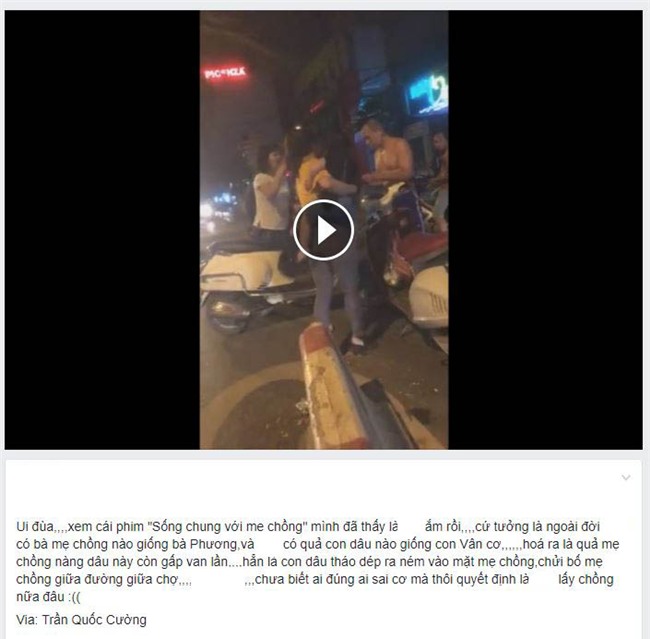 Mới đây, một trang Facebook nổi tiếng trong giới trẻ đã chia sẻ một đoạn video, theo đó có cảnh mẹ chồng và nàng dâu đánh, chửi nhau giữa đường đông người qua lại. Đoạn video ngay lập tức nhận được sự quan tâm của cộng đồng mạng. Có nhiều ý kiến trái chiều khác nhau được đưa ra, người thì cho rằng nàng dâu quá hỗn láo, người lại nhận định vì "tức nước vỡ bờ", "không có lửa làm sao có khói".