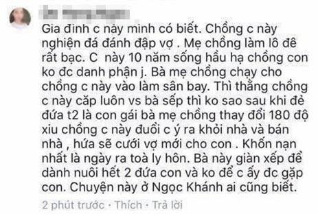 Bạn T.H chia sẻ: "Nếu đúng như nguồn trên thì tức nước nên vỡ bờ thôi. Chịu đựng 10 năm trời rồi thì có ngoan cũng không được nữa, đến lúc quá đáng quá rồi thì cũng không thể tôn trọng được, chứ đừng nói là dù mọi chuyện thế nào con dâu làm thế là không được, là hỗn một số bạn ạ. Không thể chịu được nữa thì phải hành xử theo bản năng thôi, đó là cách hành xử theo "cảm xúc của một con người" đến "con giun xéo mãi cũng quằn còn gì".
