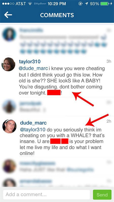 Tại sao anh dám đi ngủ lang chạ sau lưng tôi chứ. Tất cả kết thúc cùng với sự DỐI TRÁ của anh rồi Thôi nào Taylor, em khùng hả? Anh không ngủ với một con cá, anh đang trên đường tới nhà em đây, cho anh vào nhà rồi nói chuyện nhé em yêu. Được thôi, có thể tôi đã phản ứng hơi quá đà, qua đây đi rồi chúng ta nói chuyện Ôi tốt quá, 10 phút nữa anh có mặt, yêu em nhiều |