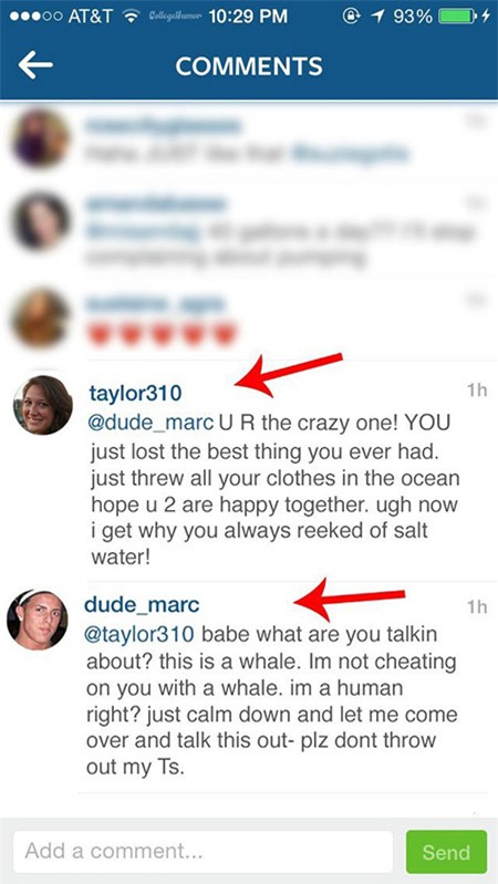 -Có anh bị điên ấy, anh vừa mất điều quý giá nhất mà anh có rồi. Tôi vừa ném hết quần áo anh xuống biển, chúc 2 người hạnh phúc, Ừm giờ thì tôi hiểu tại sao anh lúc nào cũng bốc mùi nước muối rồi! -Em đang nói gì vậy? Đấy là con cá voi, anh không lăng nhăng với con cá voi, anh là người mà, bây giờ em hãy bình tĩnh chờ anh qua rồi nói chuyện, đừng có ném đồ đạc của anh đi đấy |