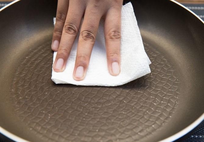 Nên dùng khăn bông sạch hoặc giấy mềm lau sạch bề mặt chảo