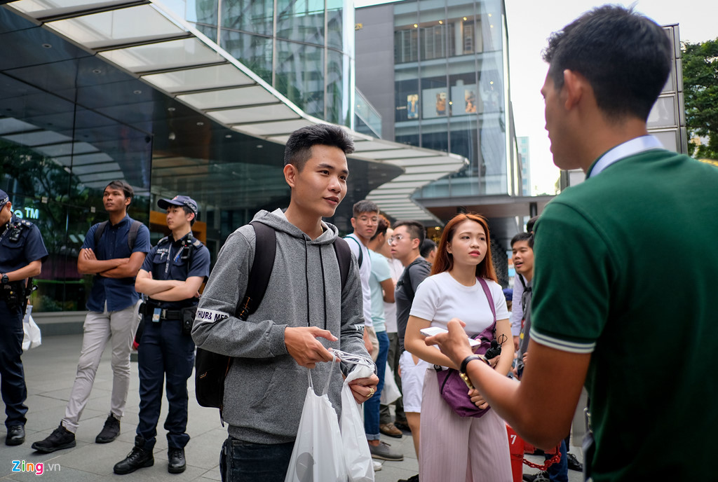 Cách Apple Store vài chục mét, thương lái đã bắt đầu gọi điện tập hợp người xếp hàng thuê để gom hàng. Mức giá rao bán tại chỗ chênh lệch từ 100-150 SGD sau 30 phút hàng xuất hiện.