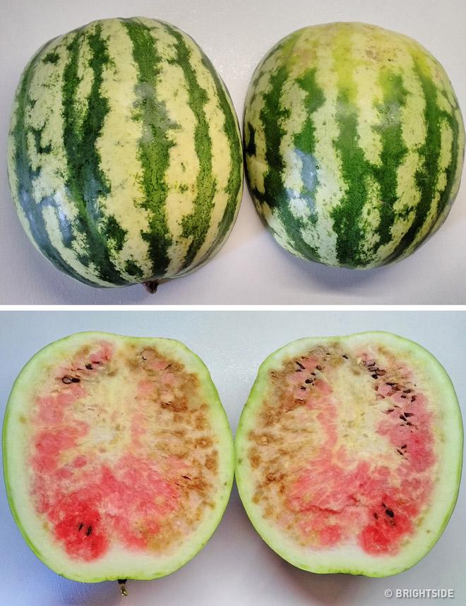 Bằng mắt thường bạn có thể nhận biết được quả dưa hấu có bị tiêm nhiều thuốc hay không.