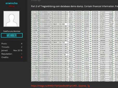 Trước đó, vào ngày 7/11, cũng tại Raidsforum, một tài khoản khác trên diễn đàn này đã đăng tải nhiều file dữ liệu được giới thiệu chứa thông tin về nhân viên và khách hàng của Điện máy xanh và Thế giới di động. Tuy nhiên, Thế giới di động sau đó đã lên tiếng khẳng định không có chuyện hacker tấn công được vào cơ sở dữ liệu của hệ thống bán lẻ này.