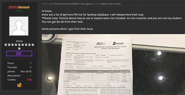 Trên bài đăng của mình, tài khoản herasvn khẳng định có rất nhiều thông tin về cơ sở dữ liệu của FPTShop. Hacker này cũng thông báo những người có nhu cầu có thể liên hệ với anh ta để tiếp cận với các dữ liệu này, không kèm theo hướng dẫn cách khai thác dữ liệu.