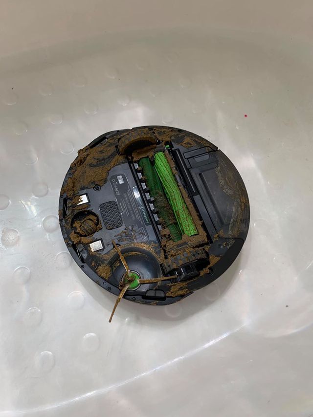 Bên dưới robot lau nhà tự động bị dính đầy phân chó và chắc chắn sẽ rất khó khăn để có thể làm sạch hết