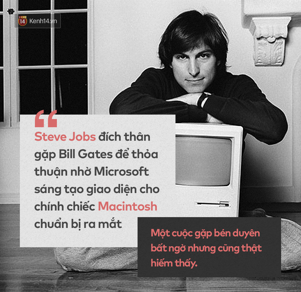 Những năm đầu thập niên 1980, có thể nói Bill Gates và Steve Jobs là một cặp bạn bè kiêm kình địch không đội trời chung với nhau. Định mệnh đã dần được tạo nên cho cả 2 bên khi Jobs đã đích thân bay đến trụ sở Microsoft ở Washington, gặp gỡ Gates và trao đổi về thỏa thuận... nhờ Microsoft sáng tạo nên hệ thống phần mềm cho chiếc Macintosh chuẩn bị ra mắt khi đó. Bill Gates sau này đã gọi đó là một "cuộc gặp gỡ bén duyên nhưng kỳ cục".