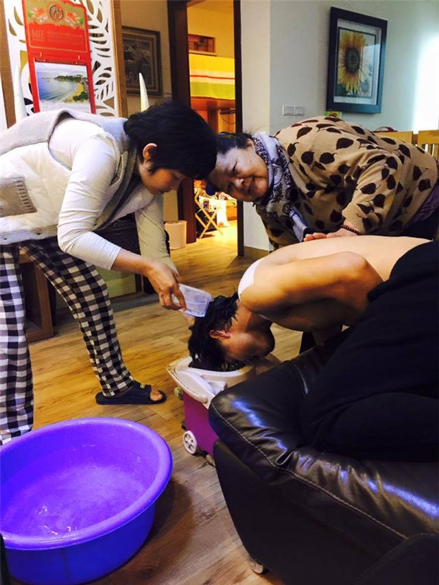 Hình ảnh Công Phượng phải nhờ tới sự giúp đỡ của hai phụ nữ trong việc gội đầu |