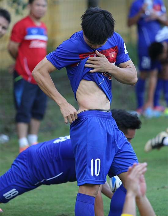 Khoe hình xăm đẹp, nhưng Công Phượng đã không gặp may trong một bài tập chiều qua. Đó là bài kéo dây thun để tập cơ bụng, tuy nhiên chiếc dây tưởng như rất chắc chắn đã bất ngờ đứt, khiến tiền đạo phố Núi bị đau rát ở vùng eo. Phải mất ít phút, Công Phượng mới tập trở lại được.