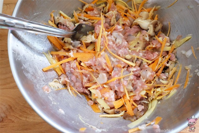 Trộn đều thịt lợn, tôm, hành khô, tỏi, trứng cùng các gia vị trong một tô lớn. Thêm các loại rau củ vào trộn nhẹ tay theo một chiều cho đều.