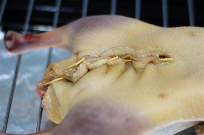 Dùng tăm nhọn bịt kín bụng vịt. Tiếp tục treo hoặc để con vịt trên giá cho khô. Tùy vào việc trời có khô ráo hay không mà thời gian phơi sẽ dao động trong khoảng từ 2-3 giờ cho đến 7-8 giờ. Có thời gian để được càng lâu thì càng ngon.