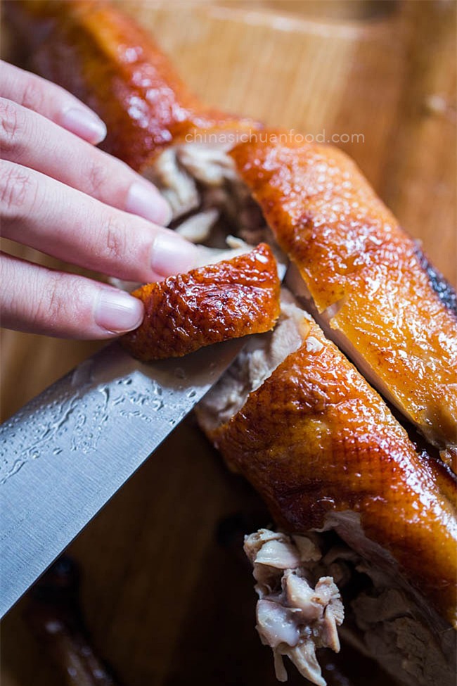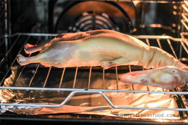 Lưu ý nhỏ: Khi cho vịt vào lò nướng thì da vịt phải thật là khô, vịt phải được treo lên trong khoảng thời gian tối thiểu là 3 giờ. Để da vịt có màu vàng nâu, bóng đẹp thì sử dụng đường mạch nha nhé.