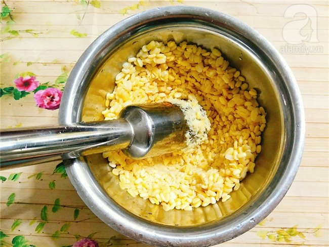 Đậu xanh cũng vo sạch, ngâm nước 3-4 tiếng cho đậu nở mềm, đổ ra xả lại bằng nước sạch rồi cho thêm chút muối trộn đều, đem hấp chín sau đó xay nhuyễn đậu hoặc cho vào cối giã nhuyễn đều được.